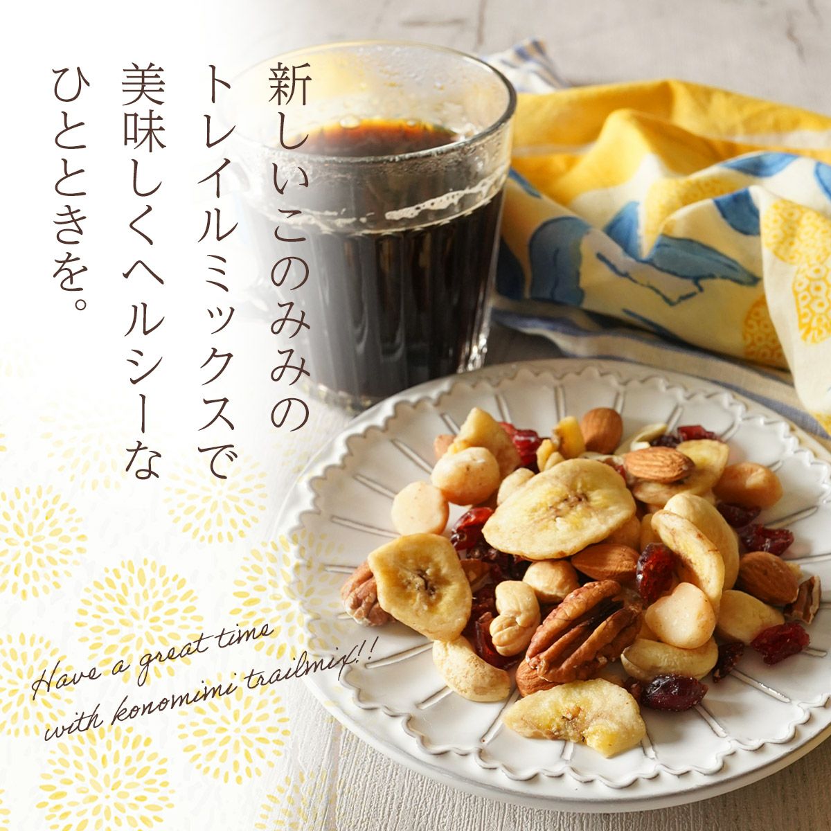 他の画像を見る ピーカンナッツ、アーモンド、マカダミアナッツ、カシューナッツ、クランベリー、バナナチップス。 【まとめ買い】健やか6種 トレイルミックス 320g×3袋 (ナッツ・フルーツ混合包装) 当店特別価格 ¥ 3,980 税込 バナナチップス入りミックスナッツ。ナッツ・ドライフルーツ混合包装タイプです。 詳細を見る お気に入りに登録する