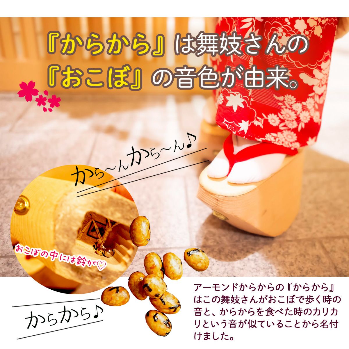 他の画像を見る 舞妓はんのおやつ 【アーモンドからから 200g】 当店特別価格 ¥ 1,500 税込 アーモンドをお醤油味のおかきで包みました。よそでは見かけない、珍しいのに懐かしい風味のお菓子です。 詳細を見る お気に入りに登録する