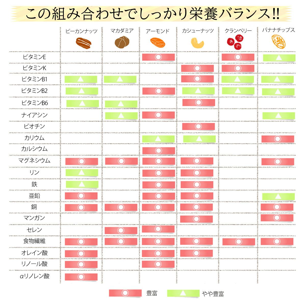 他の画像を見る ピーカンナッツ、アーモンド、マカダミアナッツ、カシューナッツ、クランベリー、バナナチップス。 【まとめ買い】健やか6種 トレイルミックス 320g×3袋 (ナッツ・フルーツ混合包装) 当店特別価格 ¥ 3,980 税込 バナナチップス入りミックスナッツ。ナッツ・ドライフルーツ混合包装タイプです。 詳細を見る お気に入りに登録する