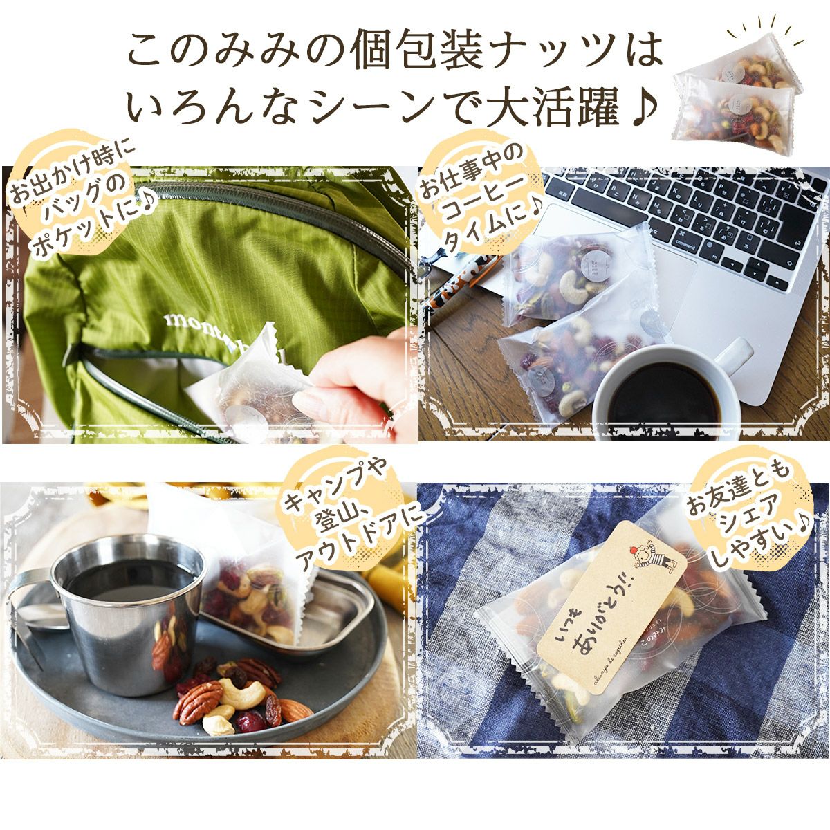 他の画像を見る ピーカンナッツ、アーモンド、マカダミアナッツ、カシューナッツ、クランベリー、バナナチップス。 【定期購入】健やか6種 トレイルミックス 320g (ナッツ・フルーツ混合包装) 定期販売 1回あたり ¥ 1,280 税込 ミックスナッツ・ドライフルーツ混合包装タイプの定期購入専用カートです。 詳細を見る お気に入りに登録する