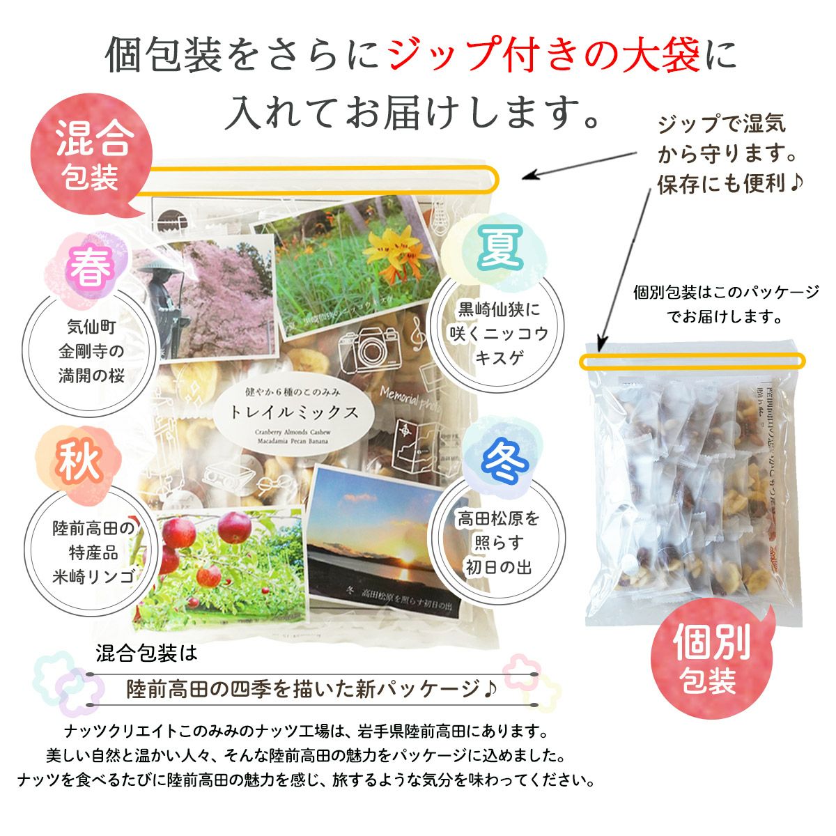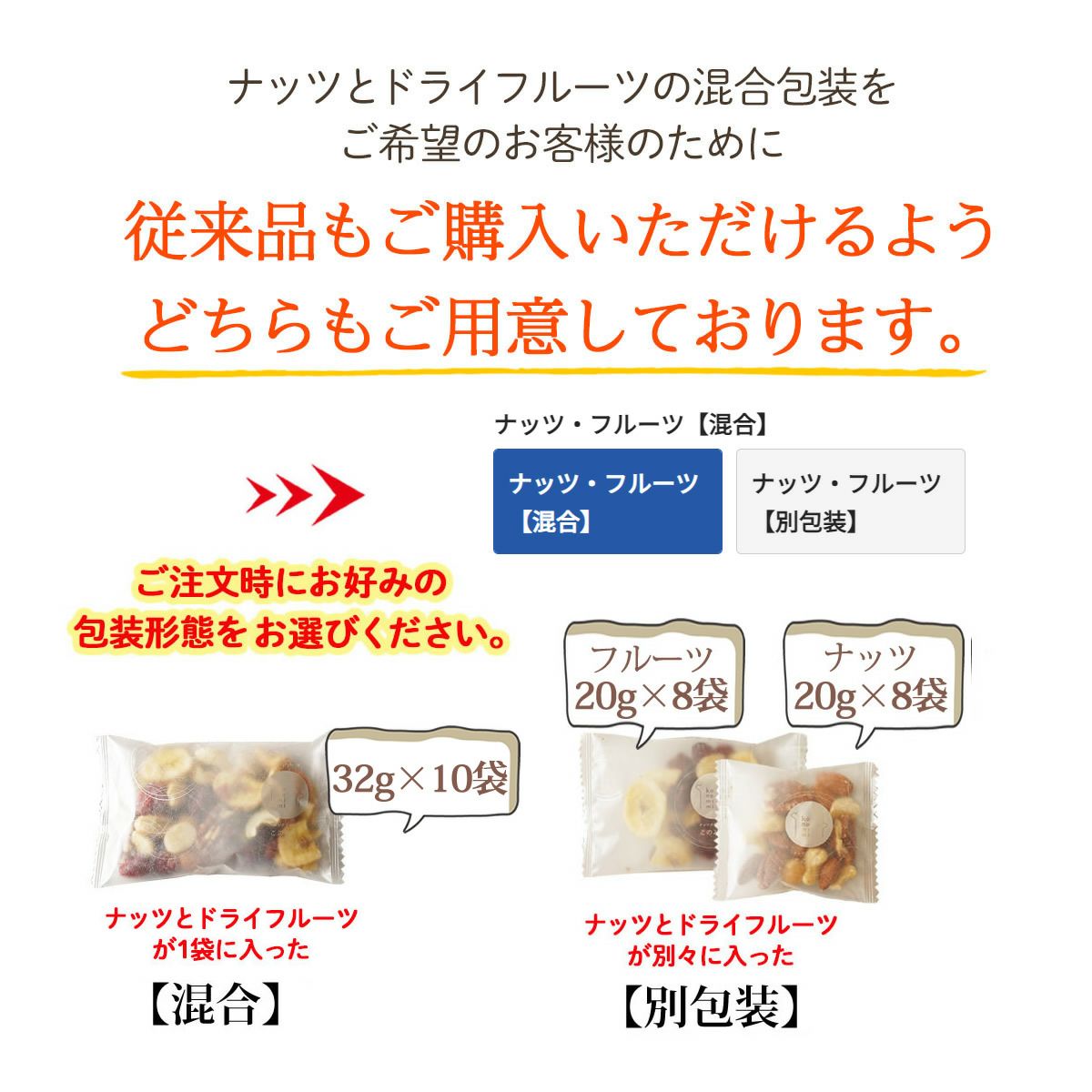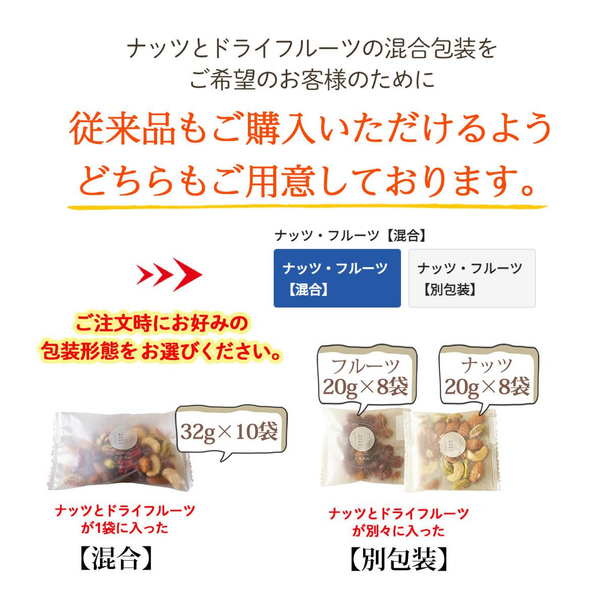 他の画像を見る ピーカンナッツ、アーモンド、マカダミアナッツ、カシューナッツ、クランベリー、バナナチップス。 個包装の形態(混合・別包装)が選べる【健やか6種 トレイルミックス 320g】 当店特別価格 ¥ 1,380 税込 トレイルミックス第2弾はバナナチップス入り。ミックスナッツ・ドライフルーツ【混合】【別包装】の包装形態を選べます。 詳細を見る お気に入りに登録する